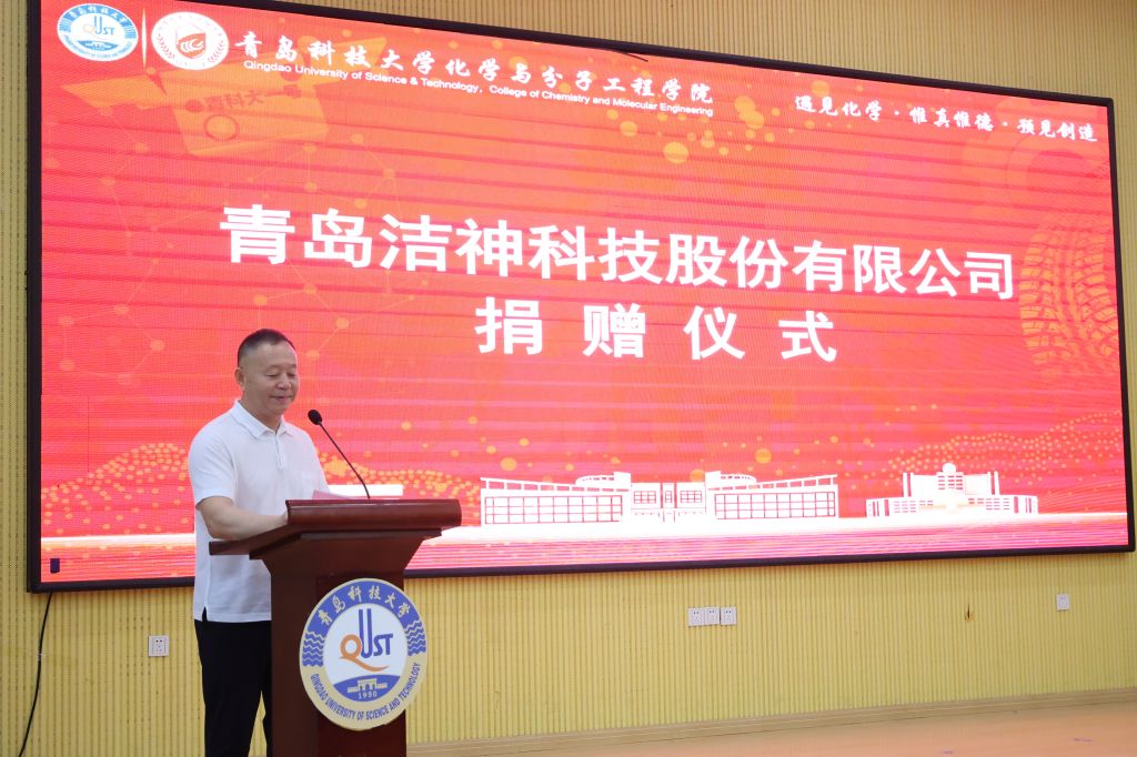 肖强在致辞中代表学院向青岛洁神科技股份有限公司为学院慷慨捐赠价值60万元物资表示诚挚感谢,并介绍了学院近年来在学科建设、教育教学、科学研究、人才培养等方面取得的成绩。他指出,青岛洁神科技股份有限公司一直以来积极参与公益事业,支持教育发展,此次慷慨捐赠不仅是对学院发展的助力,更是对广大师生的激励。学院将以此次捐赠为契机,持续推动有组织科研,深化产学研融合,进一步加强与青岛洁神科技股份有限公司等优质企业的交流合作,共同探索校企合作新模式,为培养适应社会发展需求的复合型人才贡献力量。