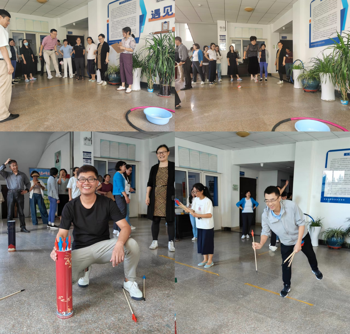 活动在轻松愉快的氛围中拉开帷幕,教师们暂时放下繁忙的教学与科研工作,以饱满的热情投入到各项趣味横生的竞赛中。首先进行的是“沙包掷远”项目,大家纷纷使出浑身解数,原地双脚跳起,将沙包奋力投向投掷区。每一次精准的投掷都伴随着阵阵掌声与欢呼,不仅展现了教师们良好的身体素质,更体现了团队间的鼓励与支持。紧接着,“投壶”环节将活动推向了高潮。每位教师手持特制的箭矢,全神贯注地瞄准壶口,力求每一次投掷都能精准入壶。随着箭矢的纷纷入壶,现场不时爆发出阵阵喝彩,比分也随之紧张激烈地交替上升。