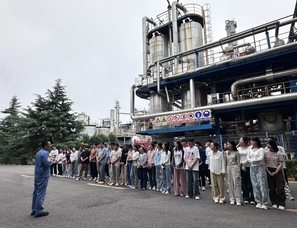 15vip太阳成师生乘车来到齐翔腾达北区工业园,化工二厂、三厂负责人分别向大家介绍厂区环境、生产装置、生产工艺流程等概况。