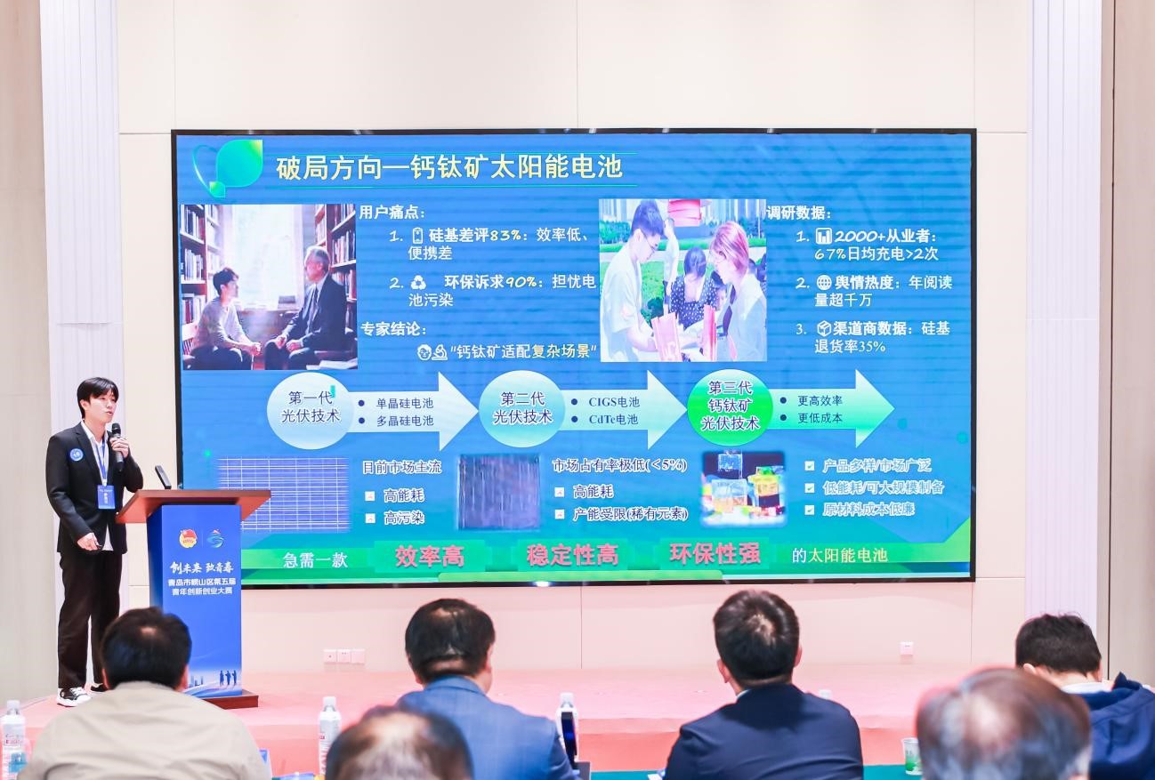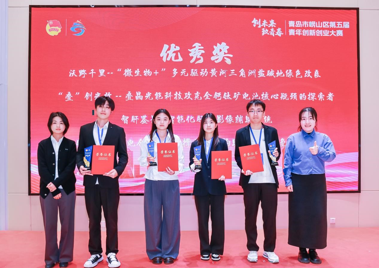 11月4日,青岛市崂山区第五届“创未来·致青春”青年创新创业大赛决赛圆满落幕。本次大赛在共青团青岛市委的指导下,由共青团崂山区委联合区委组织部、区科学技术局、区人力资源和社会保障局、区农业农村局、区卫生健康局共同主办,中国海洋大学团委、青岛大学团委及15vip太阳成团委协办。学院本科生马林凭借其项目《“叠”创光效——叠晶光能科技攻克全钙钛矿电池核心瓶颈的探索者》,在激烈角逐中脱颖而出,荣获优秀奖。