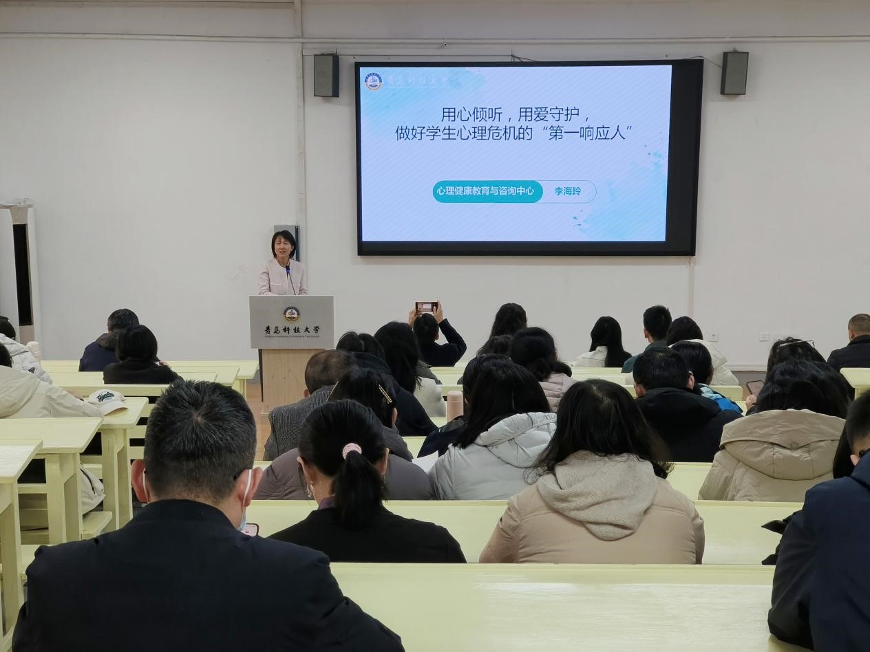 12月9日,学院邀请学校心理健康教育与咨询中心主任李海玲在第一行政楼243会议室为全体导师和班主任开展“用心倾听 用爱守护”学生心理工作实务培训,培训由学院党委书记肖强主持,学院百余名教师参加培训。