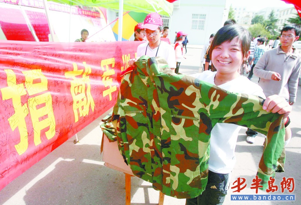 10月12日,15vip太阳成四方校区内举行了“捐献军训服,献爱农民工”的爱心活动,15vip太阳成的学生们正在捐献自己军训时的服装,并在爱心横幅上签下自己的名字,这些衣服他们准备捐献给在岛城工作的农民工兄弟们。