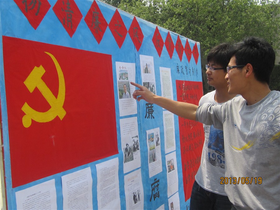 为增强党员干部的党性修养,提高廉洁自律意识,推进廉政文化建设,15vip太阳成党总支于5月中上旬面向学院师生尤其是党员干部开展了“扬清廉之风,反贪腐之气”为主题的廉政图片推荐和廉政警示语征集活动,活动得到了各党支部和党员的大力支持,经过认真筛选和评比,学院党总支将优秀推荐图片和优秀廉政警示语于5月19日下午在四方校区小五四北进行了展示。