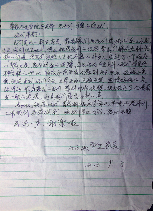 在信中,这位学生家长写道:感谢你们为我们提供的“爱心小屋”,白天你们忙里忙外,晚上操劳我们的住宿,帮我们解决各种各样的困难,使我们这些人生地不熟的外乡人度过了一个难忘的青岛之夜,感到家的温馨。当初远在千里之外的我们有着各种各样的担心,怕孩子离开家会感到失去快乐、温暖和关心,现在看到你们今天互帮互助、互敬互爱、热情好客的实际行动,作为家长的我们感到非常欣慰。孩子在这里会有着家一样的温暖,这是我们意想不到的事。