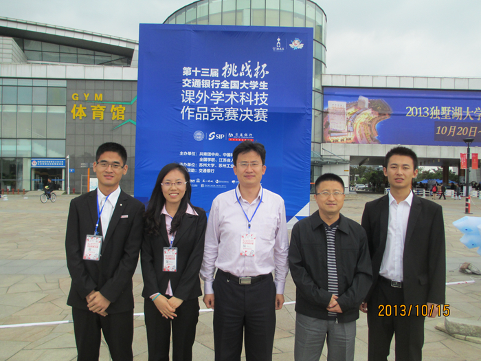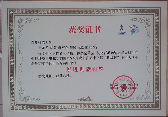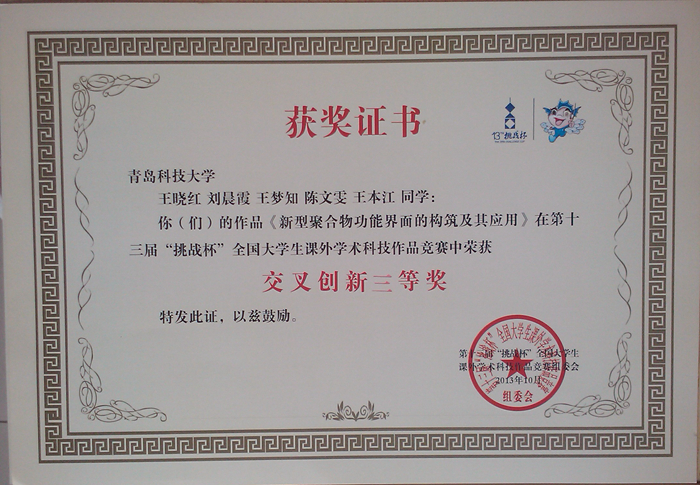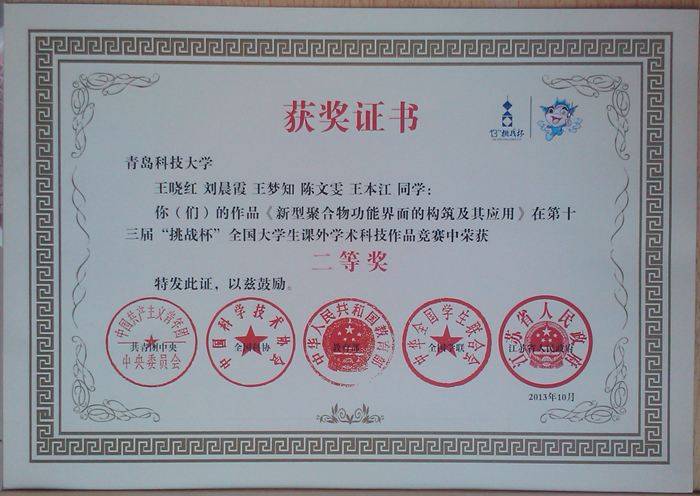 近日,由共青团中央、中国科协、教育部、全国学联、江苏省人民政府共同主办,苏州大学、苏州工业园区承办的第十三届挑战杯“交通银行”全国大学生课外学术科技作品竞赛在苏州大学闭幕。我院杨涛、焦奎指导的,王晓红、刘晨霞、王梦知、陈文雯、王本江同学的《新型聚合物功能界面的构筑及其应用》荣获第十三届“挑战杯”全国大学生课外学术科技作品竞赛二等奖。同时,王龙龙、刘茹、南富心、汪锐、耿瑞林同学的《借助自掺杂聚苯胺-氧化石墨烯纳米复合材料在中性环境中电化学检测DNA片段》荣获第十三届“挑战杯”全国大学生课外学术科技作品竞赛累进创新银奖,王晓红、刘晨霞、王梦知、陈文雯、王本江同学的《新型聚合物功能界面的构筑及其应用》荣获第十三届“挑战杯”全国大学生课外学术科技作品竞赛交叉创新三等奖。