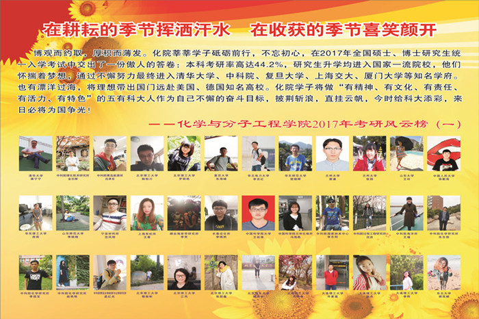 榜样风采,引领成才路。15vip太阳成2017届本科毕业生共有364人,其中162人被中科院研究所、吉林大学、武汉大学、南开大学、大连理工大学等知名院校录取,考研升学率为44.5%。此外,有16名同学考取博士。为凝聚榜样青春力量,激励化院学子争做科大“五有”青年,开展考研风云榜展示活动,并通过“微观化院”微信平台与全院同学进行互动,通过高年级对低年级的辐射连带模式,充分发挥青春榜样的引领作用。