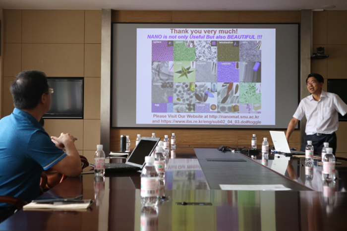在报告会上,Taeghwan Hyeon教授从如何开创绿色和大量合成均一尺寸纳米粒子的新方法开始,讲述了纳米材料在电致发光器件、医学成像和治疗领域的应用,详细生动的讲解了纳米材料的电致发光机理和新仿生配体增强纳米颗粒生物相容性和稳定性研究。