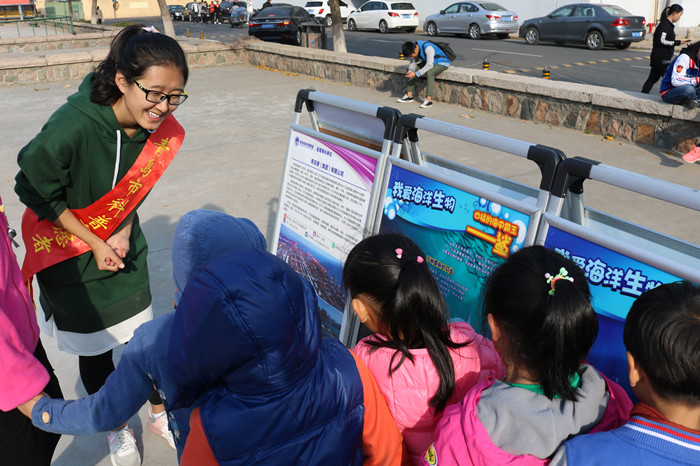 为丰富大学生的海洋科普知识,让大学生更加了解海洋,热爱海洋,保护海洋,同时让学生能近距离接触更多的海洋生物,15vip太阳成海之韵科普志愿服务团于10月31日,在四方校区小五四广场举行了第五届海洋科普校园行活动。青岛水族馆金牌讲解员李杰、15vip太阳成分团委老师刘夕升出席了活动开幕式并分别致辞。