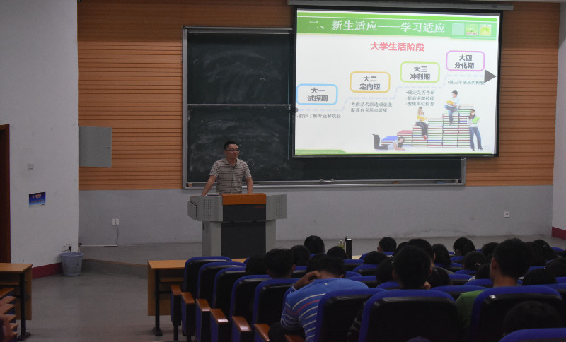 讲座中,两位老师分别针对大一新生面对的各种不适应问题予以简单概括,指出约70%的大学生存在大学适应性问题,只有20%同学在大学有明确的目标,并简单阐述了要经历的大学四年的生活,使同学们对大学有了整体的认识。随后提出几项重要注意内容:第一:大学并不轻松,高中老师总说到了大学就可以不用拼命学习了,但是事实是还是要好好学习,提升能力,锻炼自己,不能妄想混四年,虚度光阴的四年是没有任何意义的。第二:调整好自己的心态,一切从零开始。大学提供的是一种平台,一种良好的环境及优越的资源,要注意锻炼自己的学习能力及学习思路。第三:大学四年提供给学生的是一种科研思路与能力,要不断开拓勇于创新,践行学校五有精神。此外,两位老师还指出大家要从现在起做好大学生职业生涯规划,了解自己的专业,明确自己以后的努力方向。