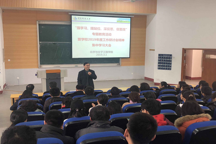 3月1日上午10点,化学学院在2教101教室召开“强学习、提站位、深反思、促整改”专题教育活动动员大会暨新学期工作部署会。会议由党总支书记王德宝主持,学院全体教职工参与会议。