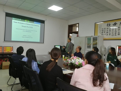 吴明娒教授详细介绍了课题组近年来在荧光粉红色发光性能调控和设计制备方面的研究成果。报告中,吴明娒教授详细介绍利用(Tb3+)n→Eu3+ 或者 Ce3+→(Tb3+)n→Eu3+能量传递以及结晶学的结构调控以提高在蓝光区域的吸收和发光性能,讨论了在蓝光区域具有宽吸收和在红光区域具有窄带发光的Mn4+氟化物,利用拓扑化学转化和外延生长机理,控制生长了具有特定化学成分、结晶学结构以及微纳结构的氟化钇钠。吴明娒教授的报告内容丰富,讲解深入浅出,激起了在座老师和同学的浓厚兴趣。报告最后,吴明娒教授用中山先生的名言鼓励同学们 “要立志做大事”,为两个“一百年”的目标不懈奋斗,为实现中华民族伟大复兴的中国梦不懈奋斗。报告内容丰富,现场气氛热烈,整个报告厅座无虚席。报告结束后,吴明娒教授和现场的老师、同学们进行了多方面的交流与讨论。