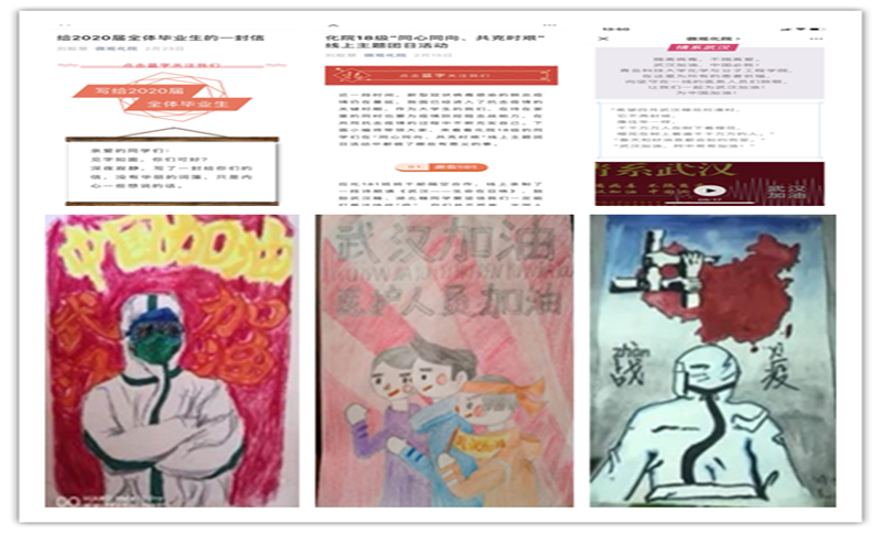 认真组织湖北等疫情较重地区学生、重点关注学生、家庭经济困难学生群体的关怀工作,充分了解重点学生及其家庭的实际困难,细致做好情感沟通与暖心帮扶。为了帮助学生消除焦虑和不安,让学生合理舒缓情绪、正确看待此次疫情,学院官微平台推送了“携手战疫,我们在一起”、“给全体2020届毕业生的一封信”、“纸短情长,文以战‘疫’”等暖心文章,鼓励同学们团结一心,共同战“疫”,并指导毕业生统筹做好考研复试及求职准备。积极组织 “画笔助力,同心抗‘疫’”主题绘画展、“同心同向,共克时艰”线上主题团日、“青春正能量”化院学子有话对你说等特色活动,让学生虽在家中也能体会到来自学院集体的关心和温暖。