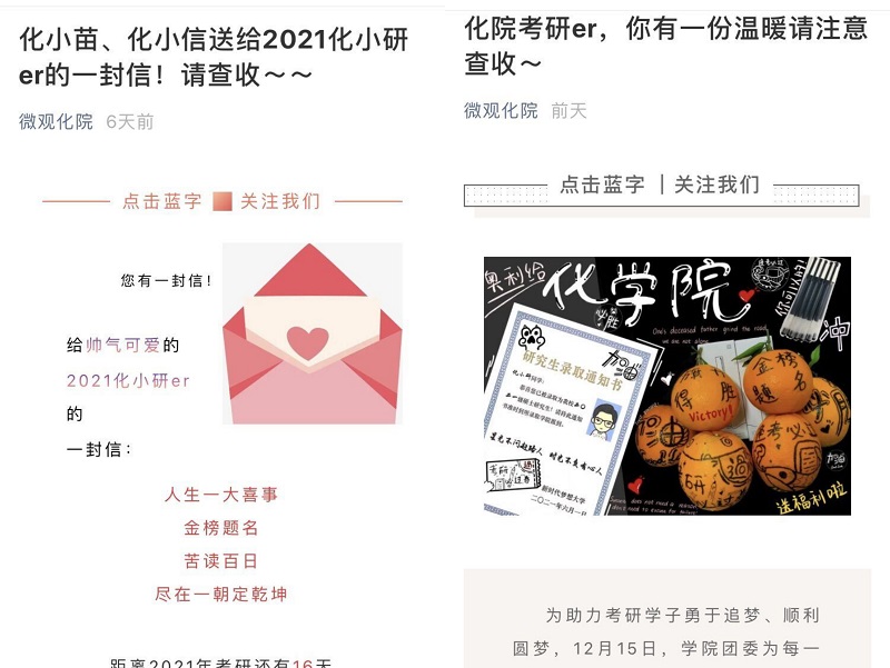 祝福远行,“研”榜题名。自12月12日起,“微观化院”公众号、易班、班级群等新媒体平台发布“致化小研的一封信”“化院考研人,您有一份温暖请注意查收”,为考研学子送去即时祝福和提醒。考研学生纷纷表示:“学院的关怀让这个奋斗的寒冬格外温暖!接下来将接续奋斗,调整心态,力争取得好成绩。”