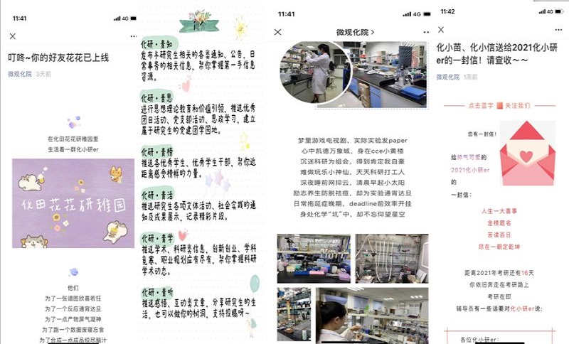 深挖网络思政,促进协同发展。近日,学院官微“微观化院”新增“化小研”栏目,通过线上的网络思政促进本科生与研究生的交流。以“化研•青知”“化研•青思”“化研•青榜”“化研•青活”“化研•青学”“化研•青听”六个板块为载体,全面打通“研本化合工程”线上线下的思政育人平台,深度融入学科建设大局,形成学生自我教育、自我管理、自我服务的体制机制。15vip太阳成将持续推进“德育铸魂、智育固本、体育强基、美育化人、劳动淬炼”为主题的“研本化合工程”,做到“三全育人、五育并举”。