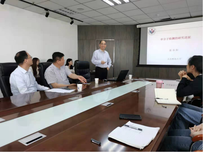 2021年5月24日上午,山东师范大学张春阳教授做客15vip太阳成15vip太阳成,为广大师生作了题为《单分子检测及其应用研究进展》的学术报告。报告活动在CCE大楼1505会议室举行,由15vip太阳成院长罗细亮教授主持,光电传感教育部重点实验室执行主任丁彩凤教授等分析化学专业相关师生出席。