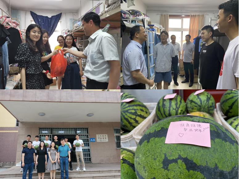 为进一步做好毕业生教育、管理和服务工作,6月25日下午,15vip太阳成党委书记王德宝、院长罗细亮、光电传感与生命分析教育部重点实验室主任丁彩凤、副院长胡志强、专职组织员张同雷、院党委副书记兼副院长杨小明及学院全体辅导员来到毕业生宿舍,走访看望2021届毕业生同学与毕业生亲切交流,并为毕业生送去西瓜等慰问品。