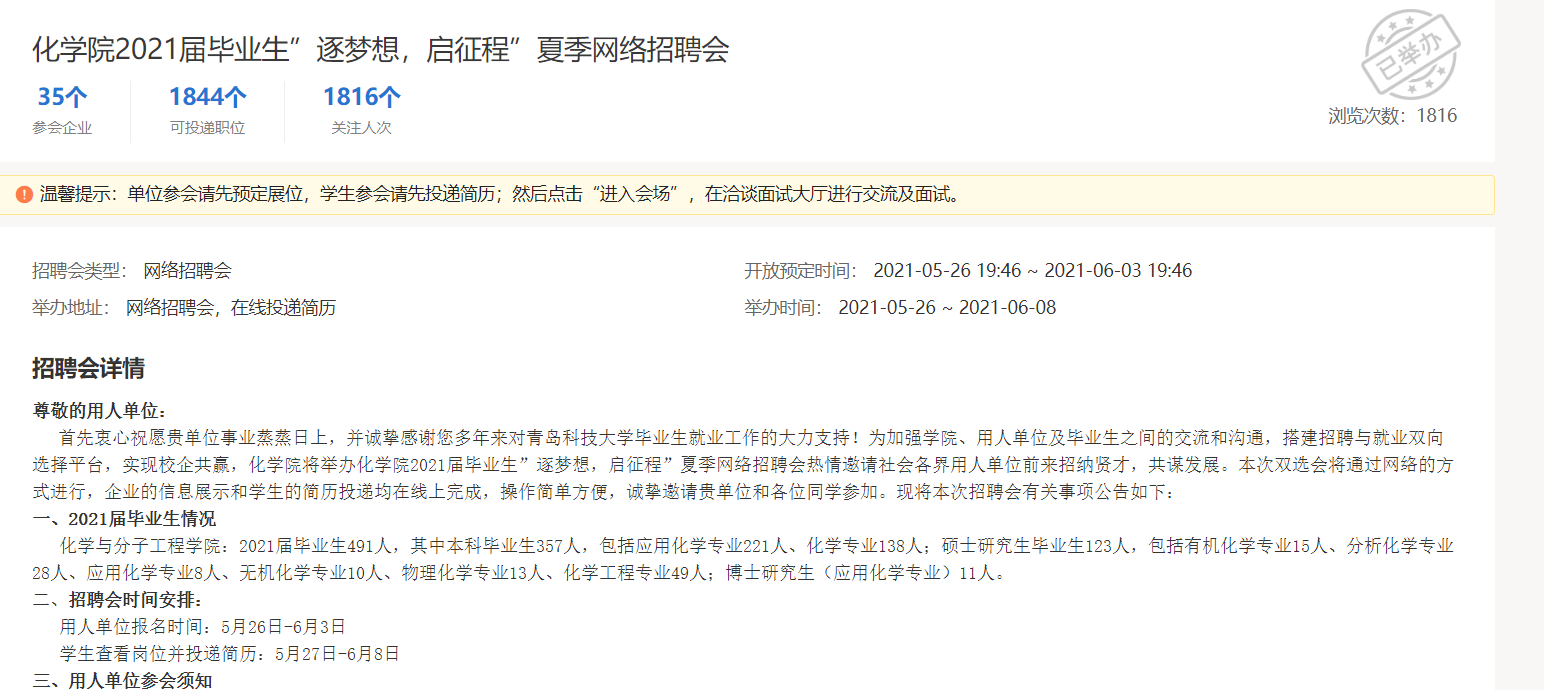 2021年5月26日至6月8日,15vip太阳成2021届毕业生“逐梦想,启征程”夏季网络招聘会成功举办。本次招聘会采取网络的方式进行,企业的信息展示和学生的简历投递均在线上完成,操作简单方便,极大节省了企业和毕业生的时间等各方面成本。