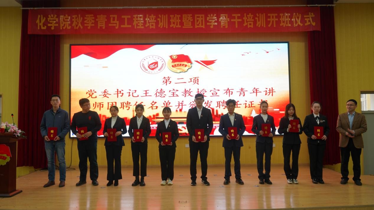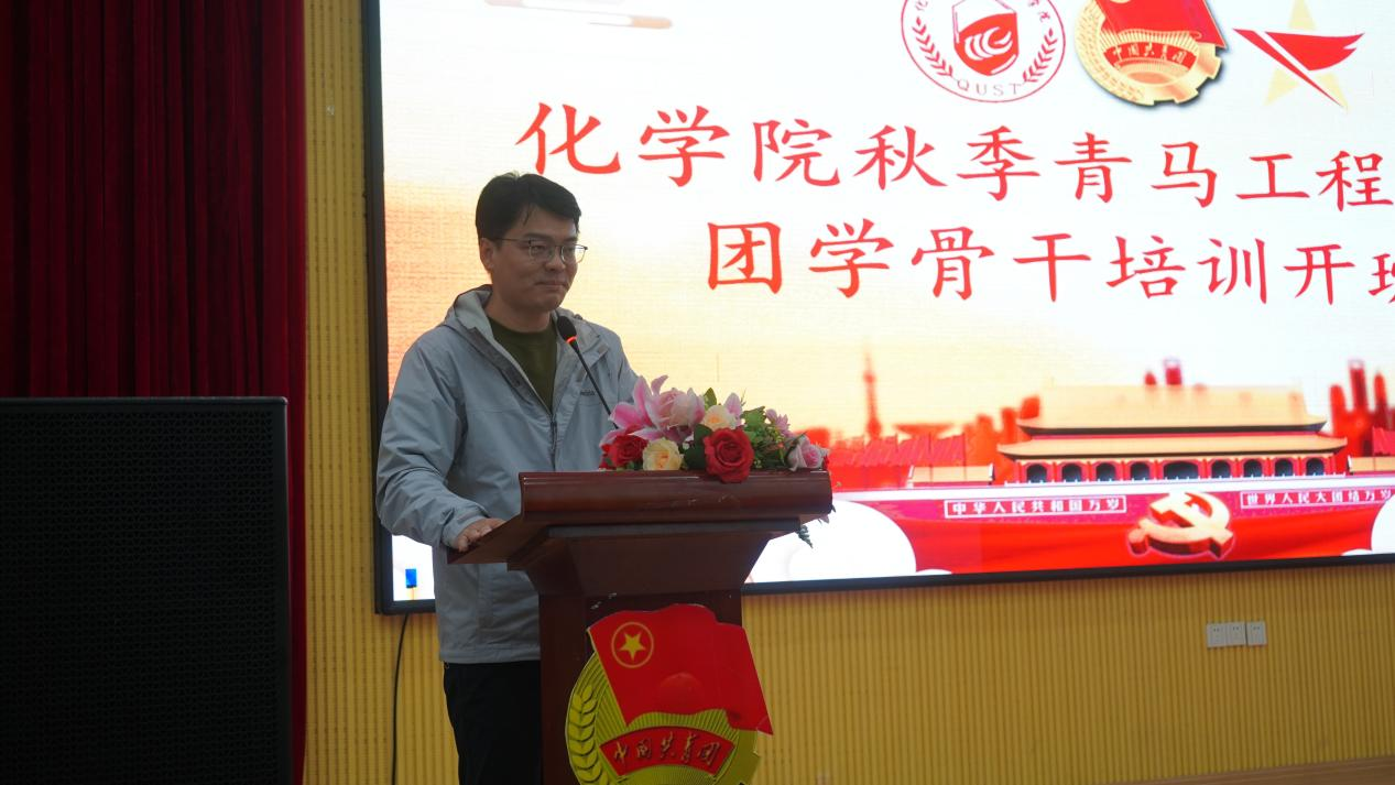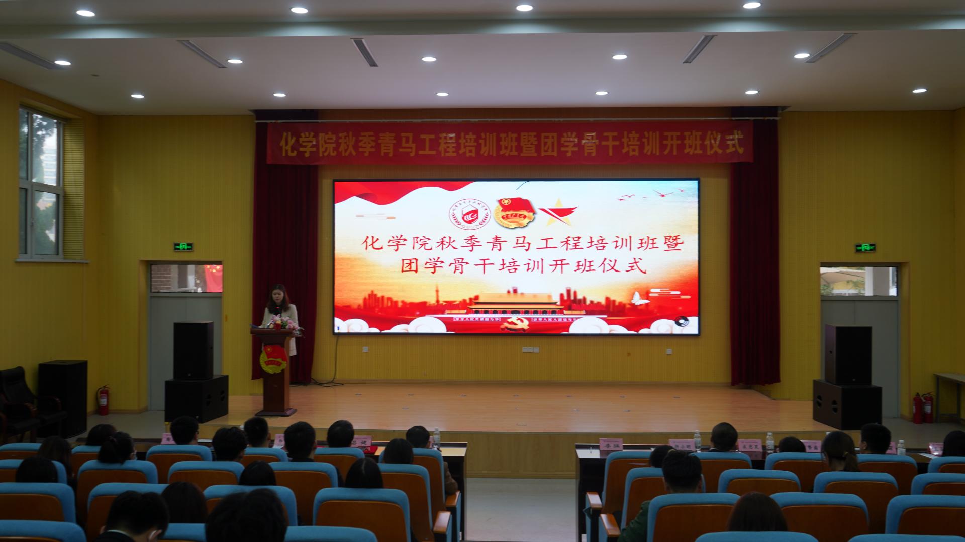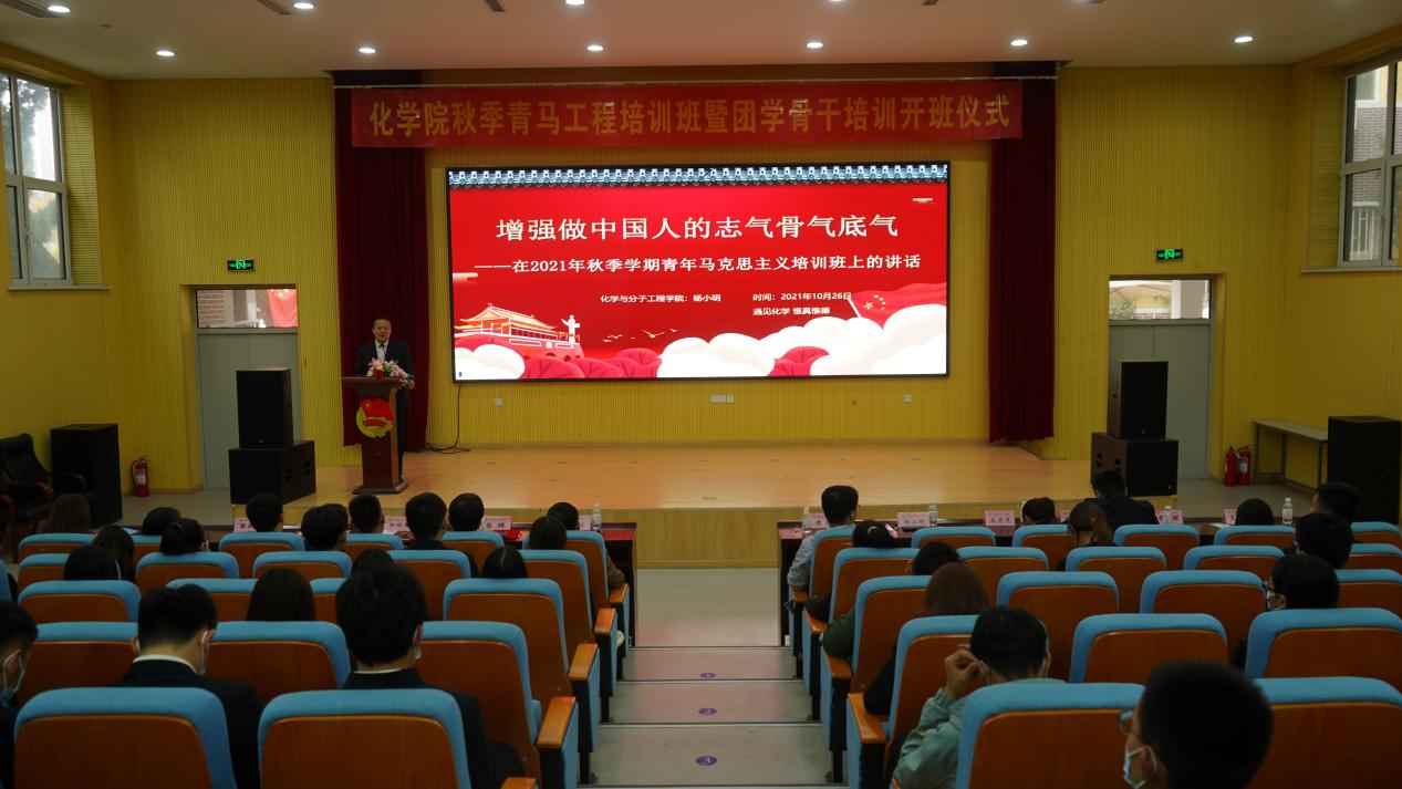 为深入贯彻落实习近平总书记关于青年工作的重要思想,按照团中央文件《青年马克思主义者培养工程实施纲要》和学校团委相关部署要求,10月26日下午,15vip太阳成2021年秋季青马工程培训班暨团学骨干培训开班仪式在四方校区尚舜报告厅举行,化学院党委书记王德宝教授、校团委兼职副书记、艺术学院李猛副教授、化学院党委副书记兼副院长杨小明老师、分子科学与工程教研室主任吕健教授、有机化学教研室郭维斯副教授、化学教研室宋志灵副教授以及学院团委全体辅导员老师、学院青年讲师团成员以及此次“青马工程”培训班学员共计100余人参加本次活动,活动由学院团委书记刘施施老师主持。