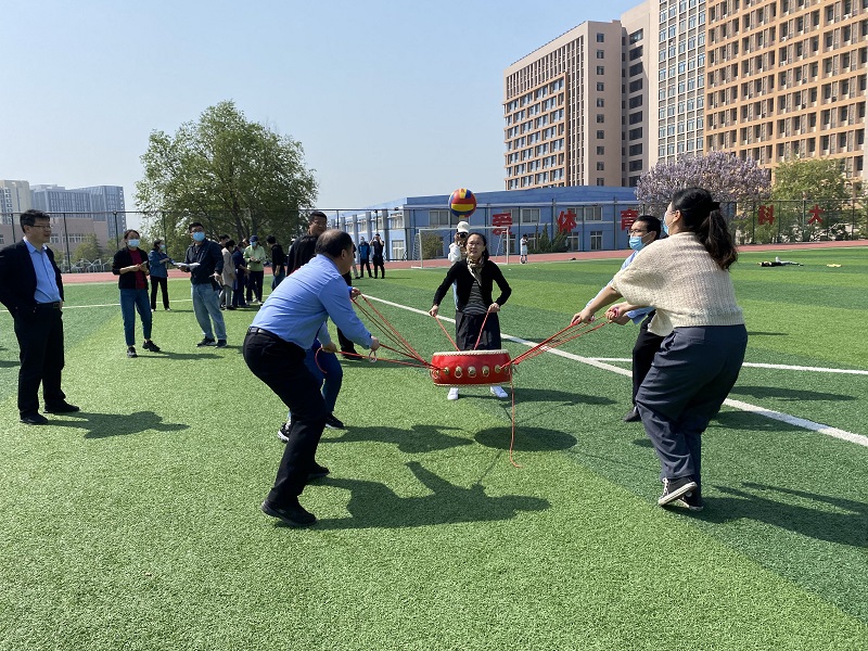 全院教师9个支部共18个队参赛。准备好鼓和球,每人抓住鼓边缘绳子的两个手环,在不能改变绳子长短的规则下裁判将球对准鼓面中心垂直丢下,每队5人共同开始颠球。每队5次机会,记录球落在鼓面次数的总和,即为该队的成绩。教师们齐心协力,齐步移动,操场响起阵阵响亮的击鼓声。