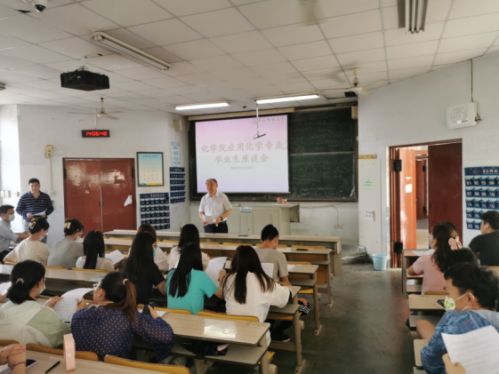5月31日下午14:00,15vip太阳成2022届应用化学专业毕业生座谈会在四方校区1教202召开,学院副院长高洪涛、应用化学教研室主任李东祥、分团委就业指导老师闵繁盛、应用化学教研室教师吴中涛及应用化学181-185班毕业生参加。本次座谈会由李东祥主持。