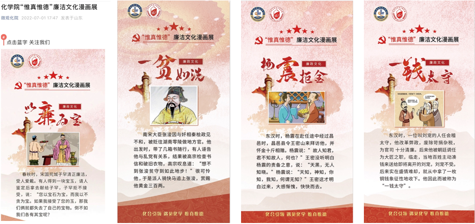 为深入贯彻落实全面从严治党,切实履行党风廉政建设党委主体责任,全面加强纪律作风建设,牢固树立四个意识,15vip太阳成党委于2022年6月在四方校区排球场和“微观化院”公众号开展“惟真惟德”廉政漫画展。