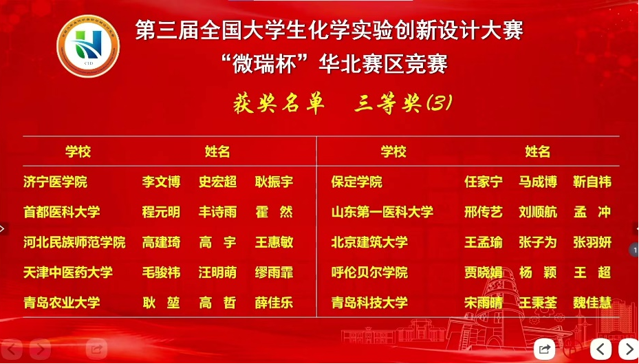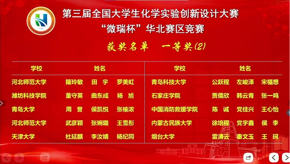 全国大学生化学实验创新设计竞赛是由中国化学会和教育部高等学校国家级实验教学示范中心联席会主办的全国性大学生学科竞赛,旨在为大学生提供实践创新能力的展示与交流平台,推动我国高等学校实践教学改革。竞赛首先按东北、华北、华东、华中、华北、西北和西南七个分赛区举行初赛,然后再进行全国总决赛。华北赛区作为规模最大的赛区,本次比赛共有来自北京大学、北京师范大学、天津大学、南开大学、山东大学等华北三省(自治区)两市的94所高校242支队伍参赛,初赛通过视频和实验论文网上评审确定179支队伍进入华北赛区复赛,复赛经两轮线上答辩,专家评审最终遴选出21支队伍参加全国总决赛。