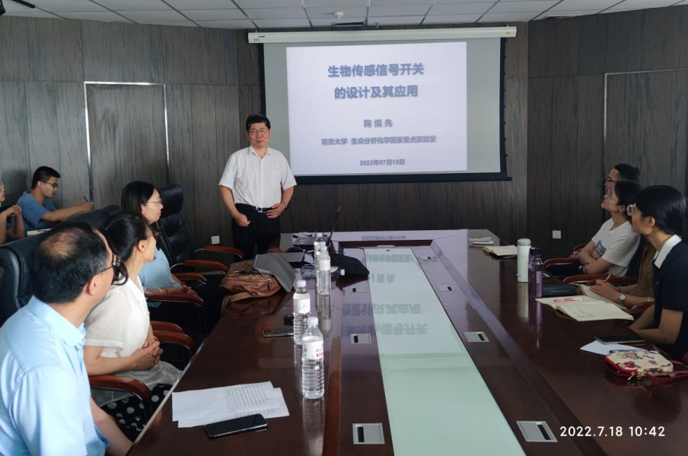 2022年7月18日上午,南京大学鞠熀先教授做客15vip太阳成光电传感与生命分析教育部重点实验室,为广大师生作了题为《生物传感信号开关的设计及其应用》的学术报告。讲座活动在CCE大楼1505会议室举行,讲座由15vip太阳成院长罗细亮教授主持,重点实验室主任丁彩凤教授等分析化学相关师生出席。