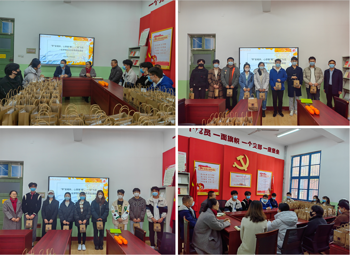 11月22日上午,2023届考研学子慰问座谈会于一政223党建活动室召开,学院党委书记王德宝、光电传感与生命分析教育部重点实验室主任丁彩凤、党委副书记杨小明、副处级组织员张同雷、毕业班辅导员及部分考研学生代表来到现场。会议伊始,王德宝表示学院老师会尽全力持续地为学生们排忧解难,永远是大家最坚强的后盾,预祝考研学子都能如愿以偿、金榜题名,一战成“硕”。丁彩凤对化学专业学习备考进行了详细的讲解与指导,鼓励同学们要保持坚持到底,不要中途放弃,在考研最后30天夯实基础,查缺补漏,稳扎稳打。杨小明叮嘱同学们在考前一定要调整好心态,重视劳逸结合,做好疫情防护,注意防寒保暖。考研学生代表也积极发言,纷纷表示一定会全力备考,牢记叮嘱,以最佳的状态迎接考试。最后,学院的各位领导和老师们为来到现场的学生代表发放寓意“平安相伴”的“平安果”和“橙功上岸”的“考研橙”以及定制的加油口罩。