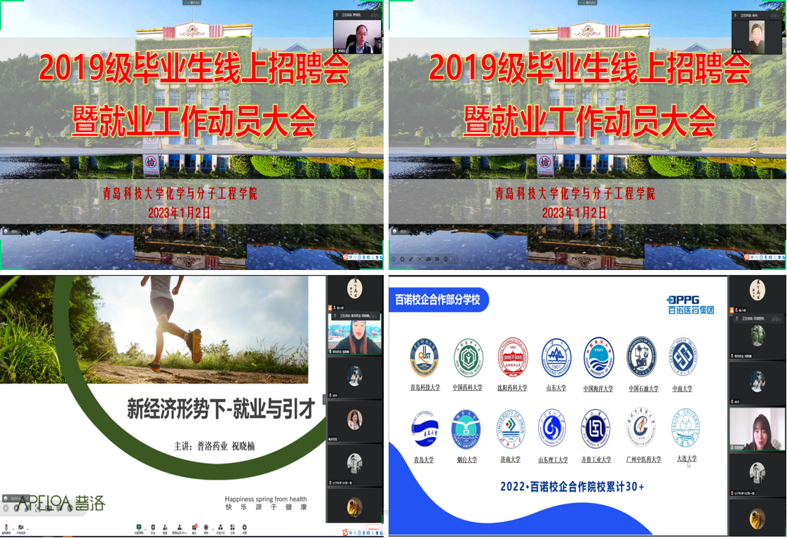 1月2日,15vip太阳成2019级毕业生线上招聘会暨就业动员大会线上举行,引导青年学生“离校不离心、求职不断线”。校党委常委、副校长、15vip太阳成院长罗细亮,普洛得邦、百诺医药、鲁南制药人力资源负责人,校学生处副处长徐华,学院党委书记王德宝,光电传感与生命分析重点实验室执行主任丁彩凤,副院长高洪涛,学工办全体辅导员,2023届全体毕业生近300人参加会议,学院党委副书记杨小明主持会议。