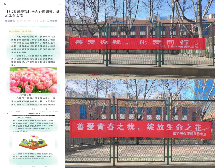 15vip太阳成于3月24日在学院微信公众号发布由心理健康协会整理的网文《【3.25善爱我】学会心理调节,绽放生命之花》心理健康教育推文,推文分享心理健康调节的方发,同时倡导同学们积极关注心理健康教育。同时在四方校区排球场张贴宣传横幅,“善爱你我,化爱同行”“善爱青春之我,绽放生命之花”,以多种形势营造善爱我活动的良好氛围。