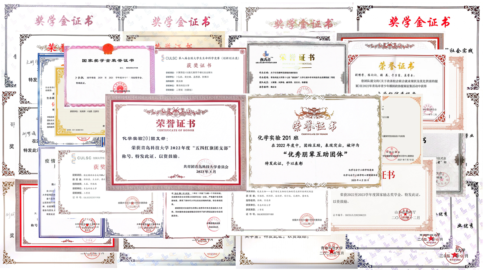 在校期间两个实验班实行“班团一体化”班级管理模式,组建“化合学习小组”,实现班级学习资源共享,打造“团结互助、共同进步”的学风氛围。化学实验201班获评“山东省先进班集体”荣誉称号;4人获“微瑞杯”第二届全国大学生化学实验创新设计大赛总决赛特等奖;3人获全国大学生生命科学竞赛国家二等奖;2人获全国大学生生命科学竞赛国家三等奖;1人获大学生创新创业训练计划国家级立项;2人获全国大学生生命科学竞赛省级特等奖;1人获山东省数学建模省级一等奖;2人获大学生创新创业训练计划省级立项。此外,班级成员在SCI期刊发表论文十余篇(两篇班级成员为第一作者),申请发明专利3项。2人获省优秀毕业生荣誉称号、3人获校级优秀毕业生荣誉称号,累积获得等国家级、省级、校级奖学金80余次。
