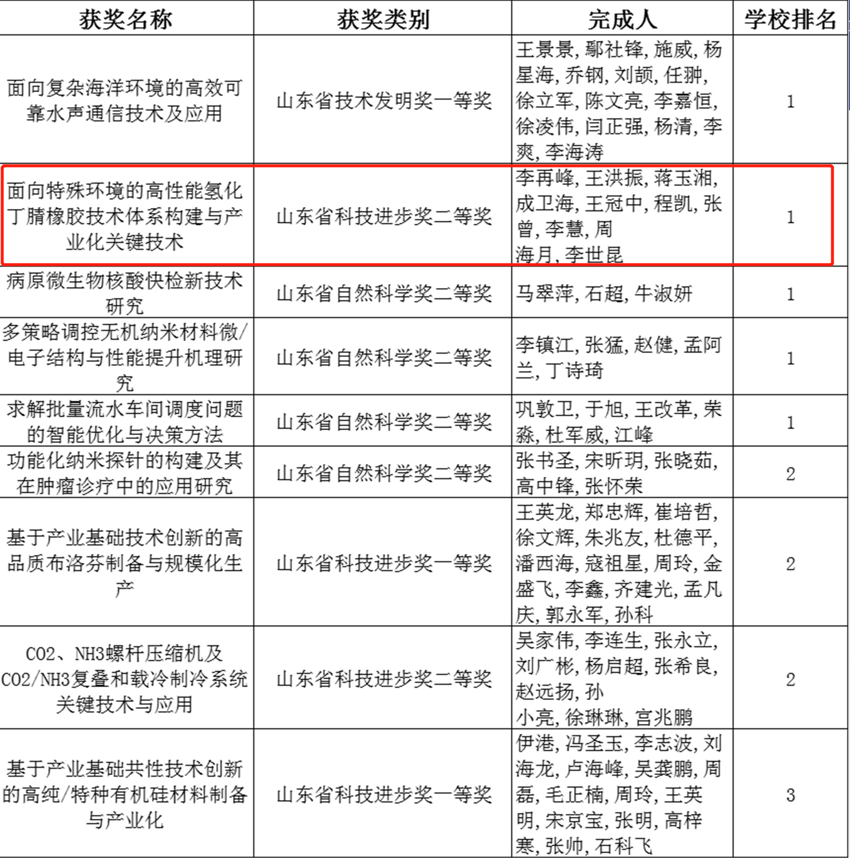 近日,山东省科学技术奖励名单公布,其中,由15vip太阳成李再峰教授团队牵头完成的《面向特殊环境的高性能氢化丁睛橡胶技术体系构建与产业化关键技术》项目荣获科技进步奖二等奖。