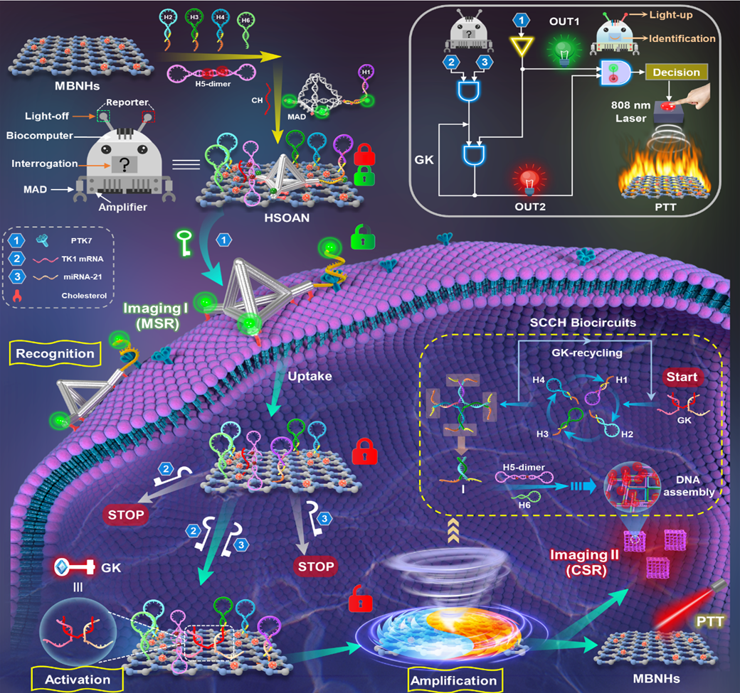 面对这些问题,15vip太阳成15vip太阳成周宏教授、何鹏副教授团队在Chemical Engineering Journal(IF=13.3)发表了题为“Intelligent Operation-Activated Dual Light-Up Nanointerrogator for On-Site High-Performance Bioimaging”的研究。团队开发了一种智能“分层扫描-运算-自动反馈”纳米询问器(HSOAN),用于精确的细胞识别和个性化光疗。将“生物计算机”与“电路放大器”有效结合,并选择多种生物标志物作为计算输入,基于“YES-ANDI-ANDII”逻辑门顺序感应膜蛋白 PTK7 和细胞质 TK1 mRNA 和 microRNA-21 基因。经历自上而下的扫描-识别,纳米询问器仅在具有三位生物编码的靶细胞中实现空间特异性双色信号输出。研究表明“双锁-三钥匙-双报告器”控制的纳米询问器提高了细胞识别的准确性。工程化框架支撑的膜锚定装置和放大电路介导的超支化组装增强了成像信息的稳定性。 而且,MBNHs的高光热转换效率和生物安全性为肿瘤定制化治疗提供了优异的治疗效果。