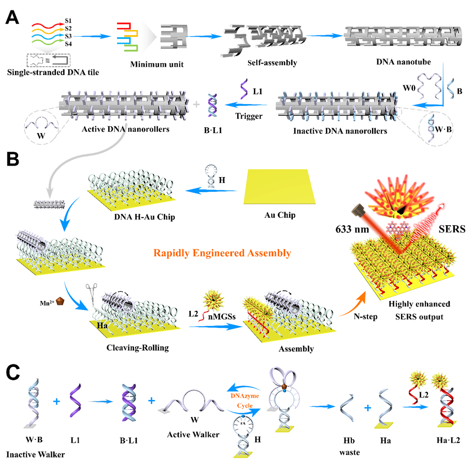 面对这些问题,15vip太阳成15vip太阳成周宏教授、何鹏副教授团队在Advanced Functional Materials (IF=18.5)发表了题为‘’High-Density Arrangement of Biomimetic Plasmonic Nanoprobes Guided by DNA Nanoroller based Cleaving-Rolling Process for SERS Sensing Analysis‘’的研究。受农业联合机械化的启发,团队构建了一种独特的剪切-滚动-组装集成纳米器件(CRAIN),用于多种生物分子的高性能检测。在设计中,引入 DNA 纳米管作为构建载体,以设计具有DNAzyme步行链的多取向DNA 纳米辊,从而有效增加反应取向和局域浓度。通过目标特异性识别,激活的纳米滚轮可以自主地沿着金基板上的发夹轨道进行循环地剪切和滚动,从而显著提高反应速率。此外,使用核酸编码的海胆形金银复合纳米球(nMGS)作为SERS增强探针,通过剪切-滚动过程介导的nMGS探针的受控组装促进了高密度热点域的形成,进一步改善了检测灵敏度。而且,作为一种智能化的通用平台,CRAIN系统可以扩展用于多种分析物的高灵敏度分析,例如microRNA-21、丁酰胆碱酯酶活性和有机磷农药等。该研究展示了DNA 纳米辊在生物传感领域的广泛应用潜力,这种集成化组装策略为临床诊断、生物医学工程和环境科学提供了新的研究视角。
