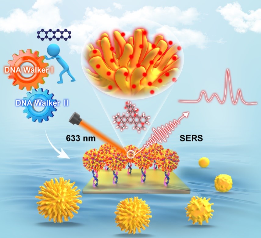 针对以上挑战,15vip太阳成15vip太阳成周宏教授团队、何鹏副教授在Small(IF=13)上发表了题为“Engineering Assembly of Plasmonic Virus-Like Gold SERS Nanoprobe Guided by Intelligent Dual-Machine Nanodevice for High-Performance Analysis of Tetracycline”的研究。该研究设计了一种新型的双机联动纳米器件(DMLD)。以挂锁适配体组件作为启动指挥中心,核酸编码的类病毒多刺突金纳米粒子(nMVANs)作为信号指示器,级联步行者电路作为处理器,实现了对TC的高性能分析。MVAN 中刺突顶点和刺突间纳米间隙的存在促进了强烈的电磁近场聚焦,为nMVAN的高SERS活性提供了保障。而且,通过多级Walker催化电路之间的顺序激活,DLMD系统能够将有限的TC识别转化为DNA扩增子引导的SERS探针的大规模工程化组装,从而实现全域等离子体热点的协同增强。高活性仿生探针和多机模块化设计的精巧结合这一构建理念凸显了智能纳米器件在分析环境和食品中的痕量危害物方面的巨大应用潜力。