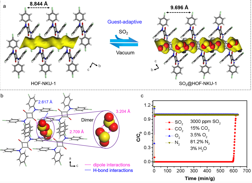 2025年2月26日,南开大学材料科学与工程学院卜显和院士/李柏延特聘研究员团队联合浙江师范大学/福建师范大学陈邦林院士团队在国际顶级学术期刊《Nature Chemistry》上发表题为“Flue Gas Desulfurization and SO2 Recovery within a Flexible Hydrogen-Bonded Organic Framework”的研究性文章。该研究提出一种自适应柔性氢键有机框架材料设计的新方法,此方法首次开发了一种兼具形状记忆和自适应孔道的疏水氢键有机框架材料,以解决在实际高湿度烟道气中选择性吸附二氧化硫(SO2)的难题,并通过解析负载SO2的单晶结构解释了分子层面的作用机理,对于进一步开发和拓展具有特异性高效气体吸附分离材料提供了新思路。