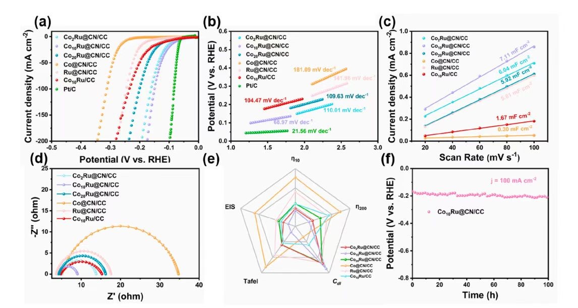 图2. Co2Ru@CN/CC、Co10Ru@CN/CC、Co20Ru@CN/CC、Co@CN/CC、Ru@CN/CC及Co10Ru/CC的HER性能。(a)LSV曲线,(b)塔菲尔斜率,(c)Cdl曲线,(d)奈奎斯特图,(e) η10 、 η200 、Cdl、塔菲尔、EIS五元对比图。(f)Co10Ru@CN/CC的稳定性图。