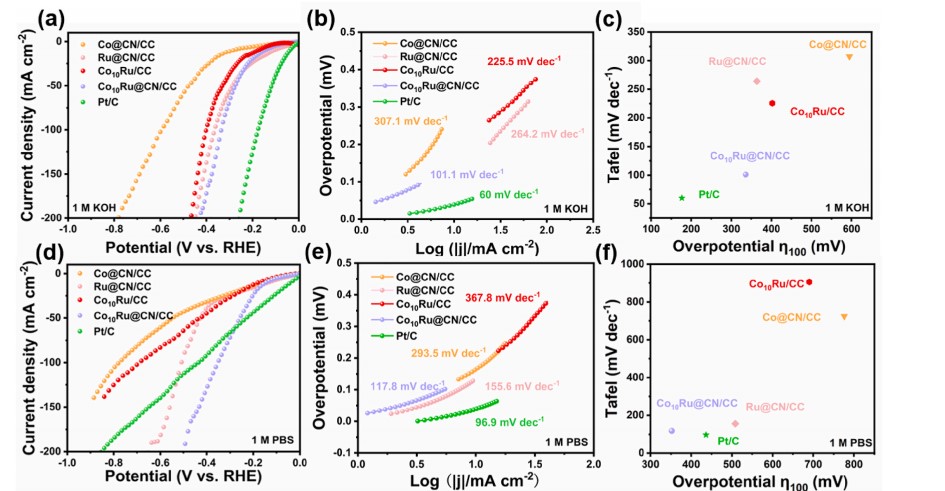 图3. (a)、(d) HER的LSV,(b)、(e) Tafel斜率图,(c)、(f) Co10Ru@CN/CC、Co@CN/CC、Ru@CN/CC、Co10Ru/CC和Pt/C在1 M氢氧化钾和1 M PBS电解质中的Tafel与 η100 对比图。