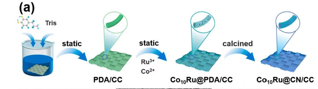 图1. 基于碳布制备自由支撑氮掺杂多孔碳负载CoRu合金材料(Co10Ru@CN/CC)的合成工艺流程图。