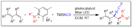 1,3-二烯的选择性双官能化是一个有挑战性的研究领域,该类反应可以从易得的原料出发转化成高度官能团化的有用分子。含氮化合物广泛存在于生物活性天然产物和药物分子中,引入氨基或其等效基团的1,3-二烯双官能团化最近得到了快速发展。然而,高选择性的引入两个不同含氮官能团的方法还未见报道。