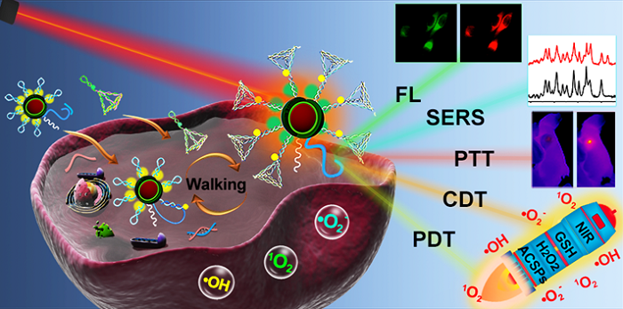 癌症是对人类健康最严重的威胁之一,早期准确诊断和有效治疗肿瘤对提高肿瘤治愈率具有重要意义。MicroRNA (miRNA)作为一种很有前途的生物标志物,在调控肿瘤相关基因中发挥着重要作用。其异常表达可能为多种癌症的发生和发展提供有价值的信息。因此,可靠的miRNA分析对于临床诊断、靶向治疗和预后监测至关重要。然而,由于肿瘤环境复杂,且肿瘤细胞中miRNA丰度极低,精确检测细胞内miRNA仍存在严重的挑战。开发一种集诊断和治疗功能于一体的诊断平台已成为当前研究的热点,其中PTT和ROS介导的治疗因其无创、穿透深、高效、副作用少而受到广泛关注。