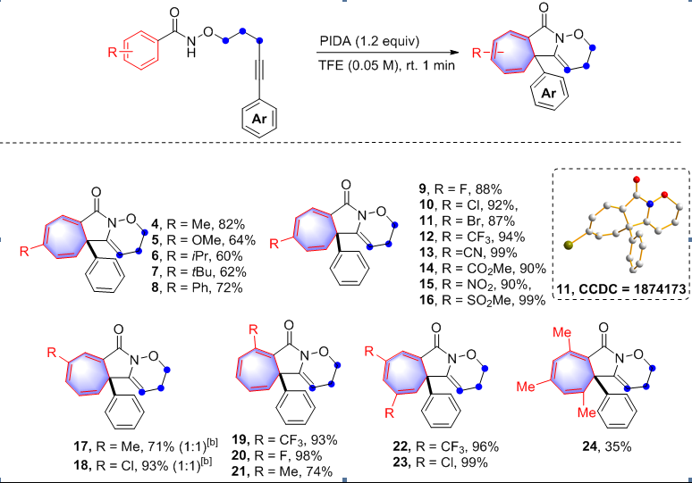 芳环去芳构化反应一直是有机化学研究的热点课题,过去几十年,吲哚的去芳构化反应取得了长足的进展,而简单苯环的去芳构化反应研究甚少,一般是由Buchner反应实现,即铑催化剂下,苯环与重氮化合物发生去芳构化反应得到环庚三烯化合物。但是昂贵的铑催化剂增加了反应成本,同时重氮化合物具有易爆的特性,此类反应也极具危险性。近期报道了一种高碘化合物促进的由芳基酰胺构建环庚三烯的新方法(图1)。该方法无需金属催化剂,底物制备简便,官能团普适性良好,条件温和,反应迅速(1分钟之内便可完成反应)。最高产率可达99%。这是第一例无金属促进的构建环庚三烯化合物的方法,拓展了芳环去芳构化的研究,同时也为制备具有药物活性的骨架分子奠定了基础。不仅如此,以烯酰胺为反应底物,此反应可得到稠环丙烷类多环化合物,进一步拓展了环丙烷类化合物的合成方法(图2)。