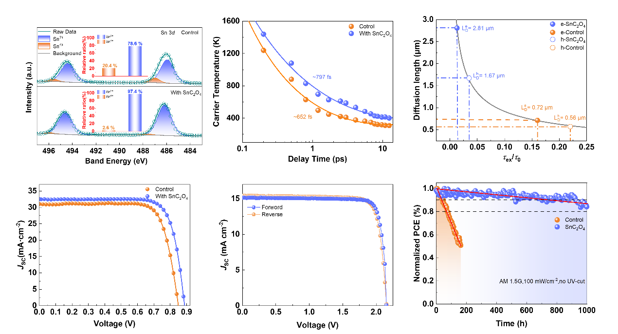 15vip太阳成周忠敏团队与合作者报道了将草酸锡(SnC2O4)引入锡铅钙钛矿前驱体溶液中以调节热载流子冷却动力学。SnC2O4的添加增加了载流子扩散的长度,延长了载流子的寿命,同时减缓了载流子的冷却速度。此外,SnC2O4可以与不配位的Sn2+和Pb2+离子结合,调节钙钛矿的结晶并实现大晶粒。C2O42-的强还原性可以抑制Sn2+氧化成Sn4+,并最大限度地减少所得钙钛矿薄膜中Sn空位的形成。此外,作为氟化锡(II)的替代品,SnC2O4的引入避免了由于F-离子在界面聚集而引起的载流子传输问题。