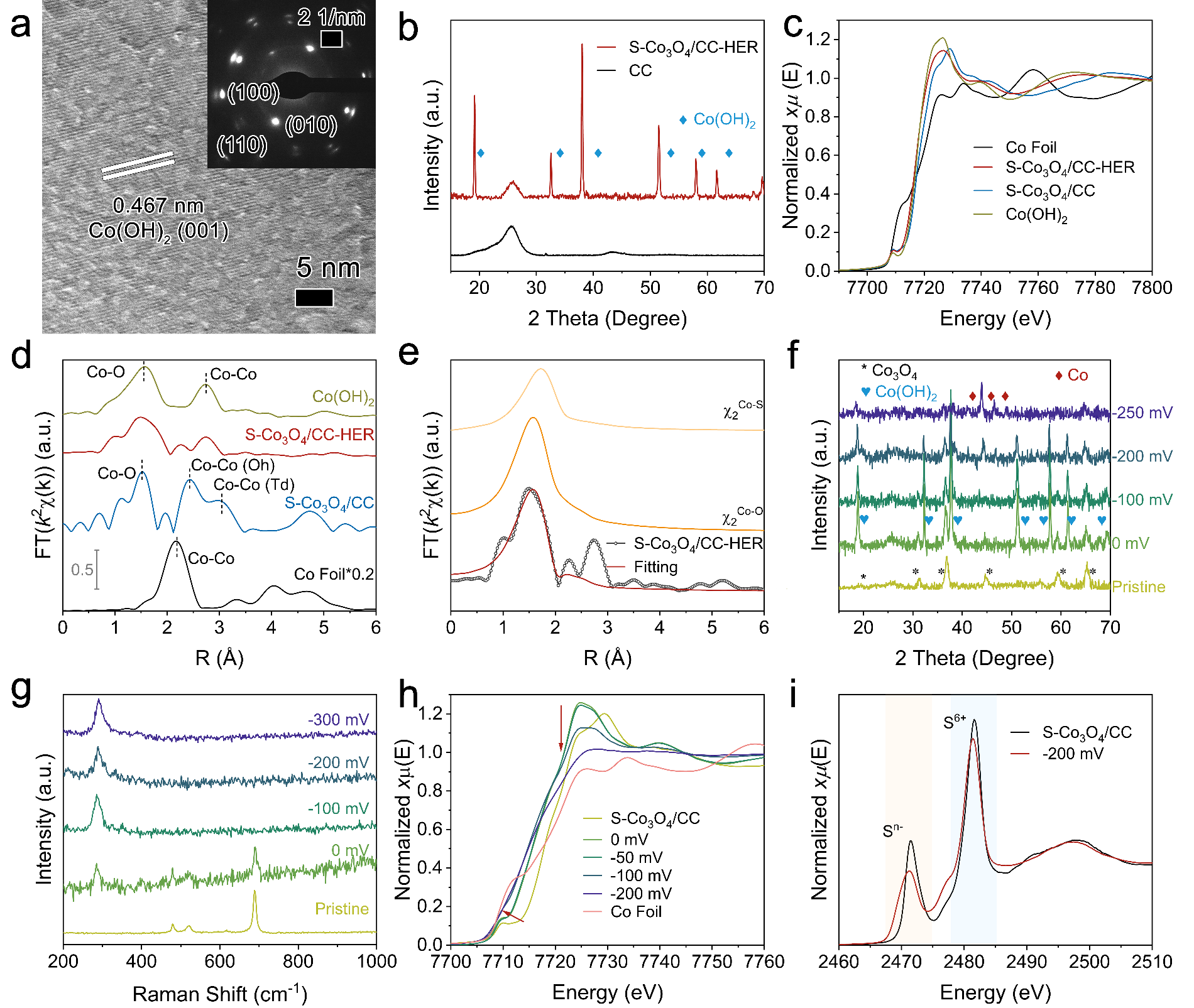 近期,15vip太阳成范开才博士首先通过H2S介导的配位阴离子置换反应,合成了均匀负载在碳布上的S掺杂Co3O4纳米片(S-Co3O4/CC)。然后,通过一系列的原位电化学表征手段以及理论计算,深入研究了电催化剂的电化学原位重构并揭示真实的HER活性中心。测试与表征结果表明:引入的氧缺陷和S配位原子能够快速诱导S-Co3O4/CC的电化学原位重构;HER条件下,S2-会与部分氧化的Co结合(CoSx)并分散在电化学原位重构的金属Co晶体表面。理论计算结果表明:CoSx与金属Co基体之间的原子级界面是主要的HER活性中心,界面处的S和Co原子能够协同加快水解离步骤,从而提升HER性能。该阴离子置换方法还被拓展到NiFe基化合物(S-NiFe/CC)的合成中,电化学重构的S-NiFe/CC表现出优越的电催化全解水性能。该研究为揭示电催化剂的电化学原位重构机制及真实活性中心提供了重要研究思路,为合成高活性、高稳定性的HER电催化剂提供了理论和实验指导。