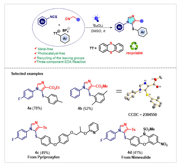 咪唑环作为常见和重要的五元N杂环之一,是有机化学中重要的结构砌块。其中,硫代多取代咪唑作为重要的咪唑衍生物存在于许多药物和生物活性分子中。因此,寻找简单、高效合成含硫多取代咪唑类化合物的方法具有重要意义。目前,可见光促进的EDA(electron donor and acceptor)活化策略是有机合成领域的研究热点,然而该方法大多集中于双分子之间的反应,多组分EDA活化策略由于受各组分之间的干扰影响,其研究仍具有较大的挑战,相关报道较少。
