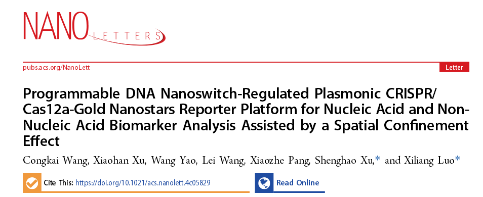 论文信息:Congkai Wang, Xiaohan Xu, Wang Yao, Lei Wang, Xiaozhe Pang, Shenghao Xu,* and Xiliang Luo*, Programmable DNA nanoswitch-regulated plasmonic CRISPR/Cas12a-gold nanostars reporter platform for nucleic acid and non-nucleic acid biomarkers analysis assisted by spatial confinement effect, Nano Lett. 2025, DOI: https://doi.org/10.1021/acs.nanolett.4c05829