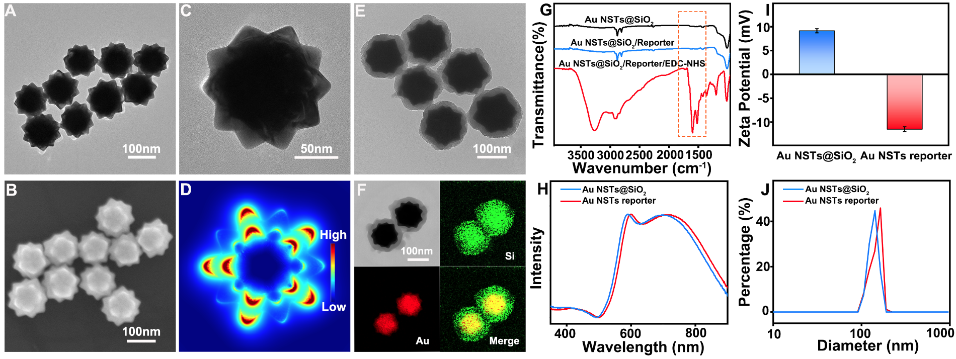 图2 金纳米星的透射电镜、扫描电镜等表征以及金纳米星报告子的红外光谱、Zata电位、吸收光谱及DLS表征。图片来源:Nano Lett.