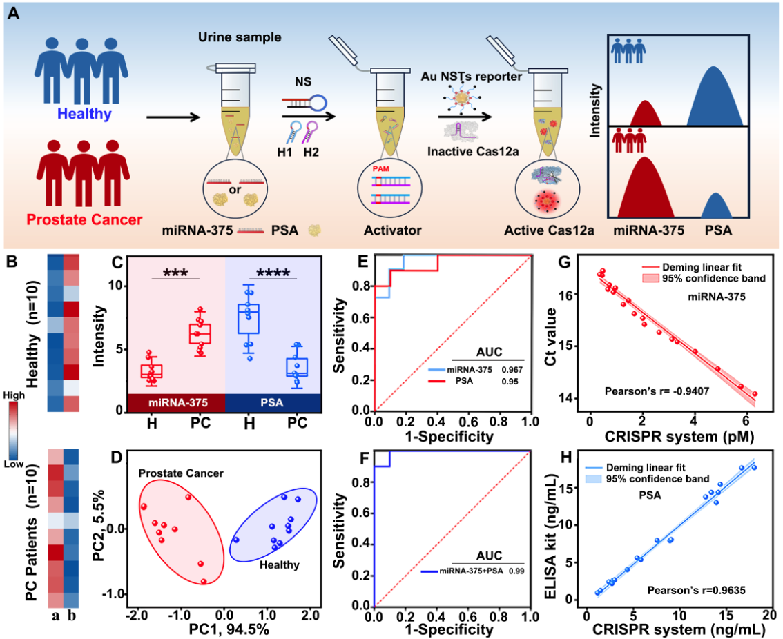 鉴于开发的NS调控CRISPR-Cas12a/Au-NSTs报告子具有出色的稳定性和检测性能,通过简单地改变NS的识别序列,进一步评估了其对临床尿液样本中miRNA-375和PSA分析的实际检测性能(图5)。实验结果表明,该策略能够实现尿液中miRNA-375和PSA的高灵敏精准定量检测,并能基于检测到的这两种尿液生物标志物的差异表达水平成功鉴别健康人和前列腺癌病人,显示了其在临床应用中的重要潜力。
