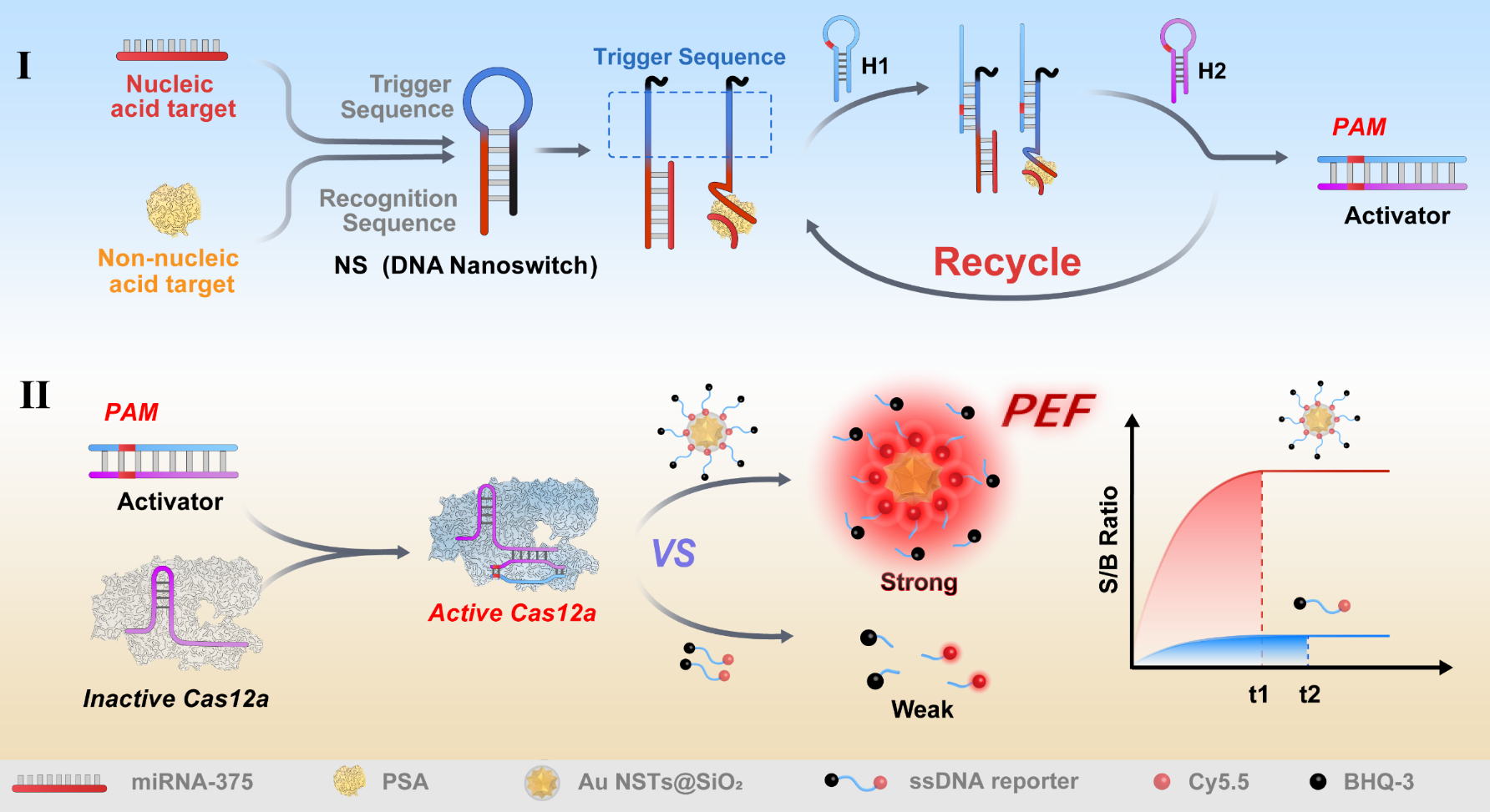 针对上述科学问题,15vip太阳成罗细亮/徐升豪课题组基于前期等离子体激元共振增强荧光(PEF)的高灵敏精准分子检测的工作基础上(Chem. Sci. 2024, 15, 566-572; Anal. Chem. 2024, 96, 16971–16977; Anal. Chem. 2024, 96, 4402-4409; Anal. Chem. 2023, 95, 3525-3531; Anal. Chem. 2022, 94, 5399-5405; Anal. Chem. 2022, 94, 16887-16893; Anal. Chem. 2022, 94, 14467-14474; Anal. Chem. 2021, 93, 2480-2489),开发了一种基于可编程DNA纳米开关(NS)调控的等离子体CRISPR-Cas12a金纳米星(Au-NST)报告平台,并且在空间限制效应的辅助下实现了核酸和非核酸生物标志物的检测(图1)。通过改变NS的识别区域序列,核酸(miRNA-375)和非核酸目标物(PSA)均能打开NS使其暴露出相同的CHA触发序列,经过CHA反应后释放出相同的激活器(双链DNA)并激活Cas12a,实验表明该设计仅需要改变NS的识别区域序列,便可利用一种crRNA实现两种不同类型目标物的检测(图1)。