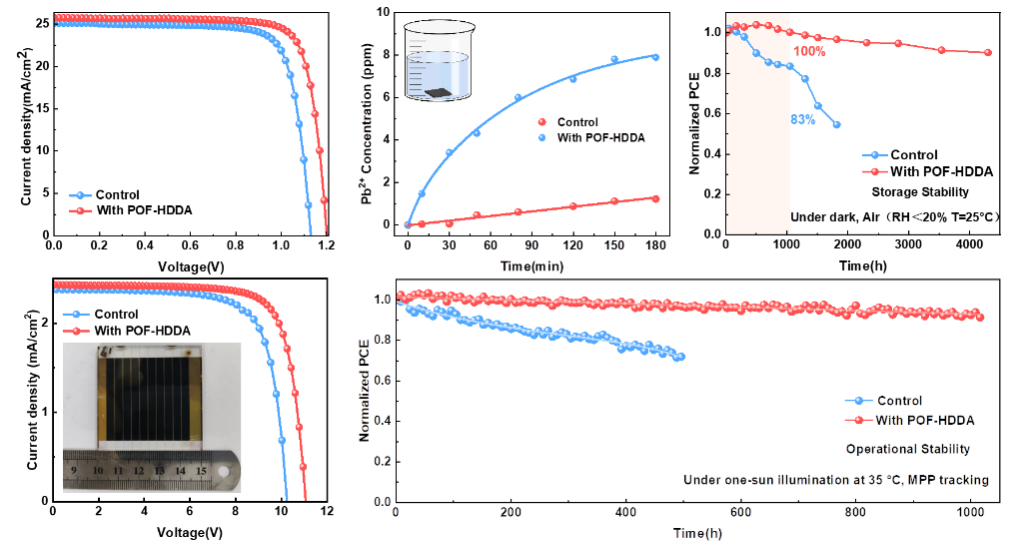 15vip太阳成周忠敏教授团队与合作者报道了一种有机小分子单体八氟-1,6-己二醇二丙烯酸酯(OF-HDDA)引入钙钛矿薄膜通过末端烯烃发生原位交联形成聚合物(POF-HDDA),获得高性能高稳定性且低铅泄漏的器件与模组。POF-HDDA克服了小分子波动大、扩散系数高、在钙钛矿内部分布不均匀等缺点。该文章提出了通过热交联形成聚合物的策略,羰基锚定钙钛矿中未配位的Pb2+,减少铅的泄漏。同时通过钝化内部Pb相关和I相关缺陷调节钙钛矿膜的结晶,降低陷阱密度,释放晶格应变,促进载流子的运输和提取。进而获得高性能高稳定的低铅泄漏的器件和模组。